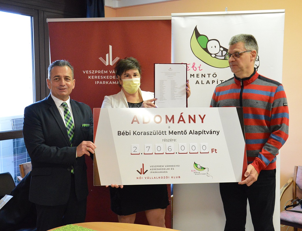 A Veszprém Vármegyei Kereskedelmi és Iparkamara Női Vállalkozói Klubjának kezdeményezésére, a Veszprém vármegyei vállalkozások idén 2,7 millió forinttal támogatták a Bébi Koraszülött Mentő Alapítványt.