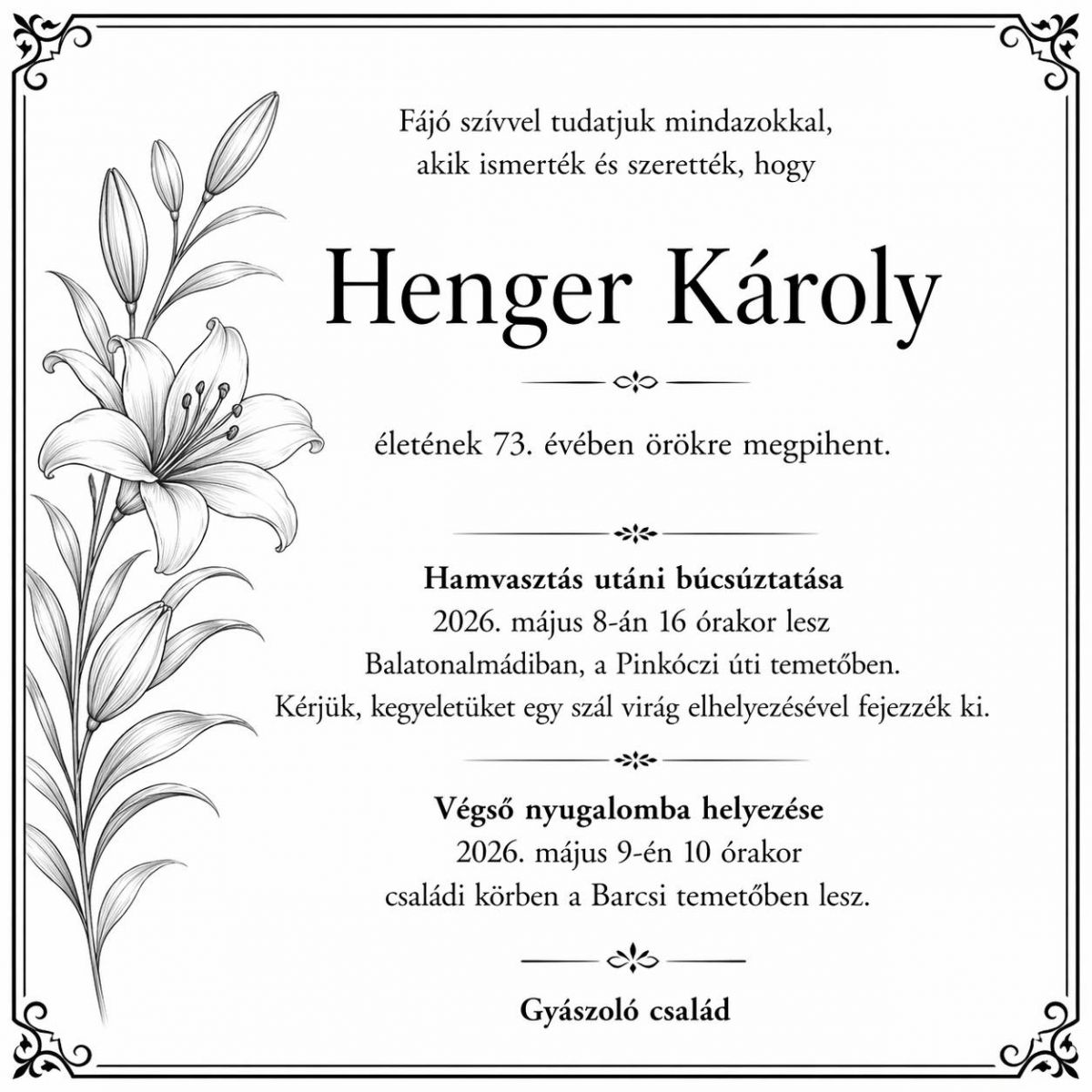 GYÁSZHÍR: Elhunyt Henger Károly, kamaránk korábbi elnöke