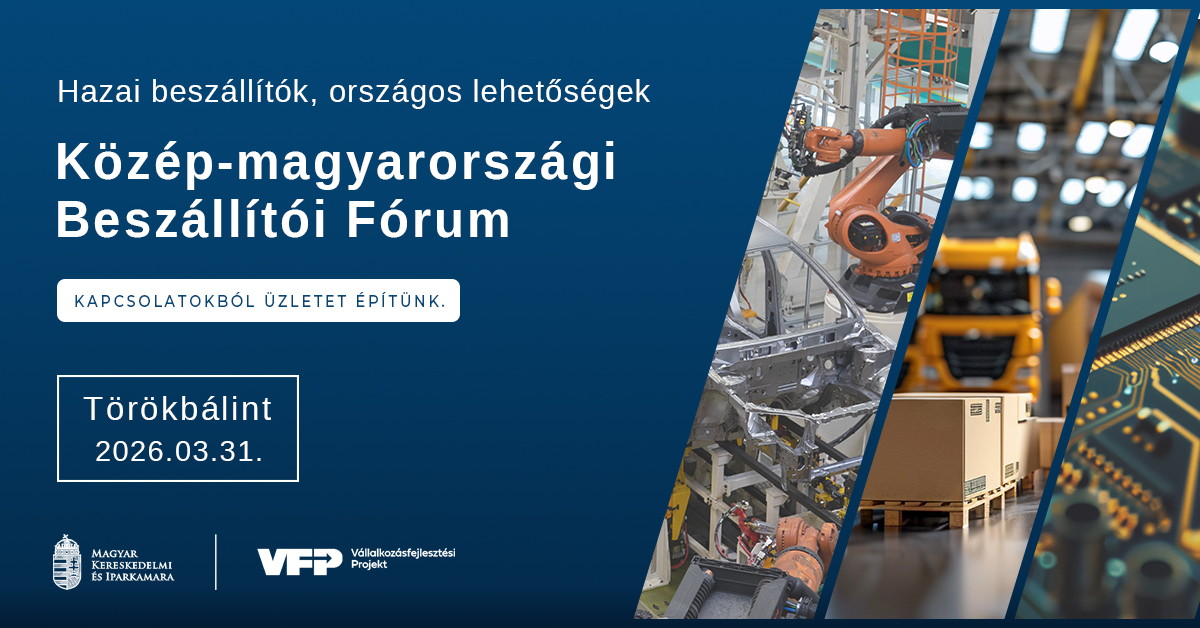 A Magyar Kereskedelmi és Iparkamara által támogatott Vállalkozásfejlesztési Program részeként a hazai kamarai hálózat idén tavasszal újabb Országos Kamarai Beszállítói Programot valósít meg. A 7 régiós rendezvényből álló programsorozat Közép-magyarországi beszállítói fóruma Törökbálinton valósul meg 2026. március 31-én.