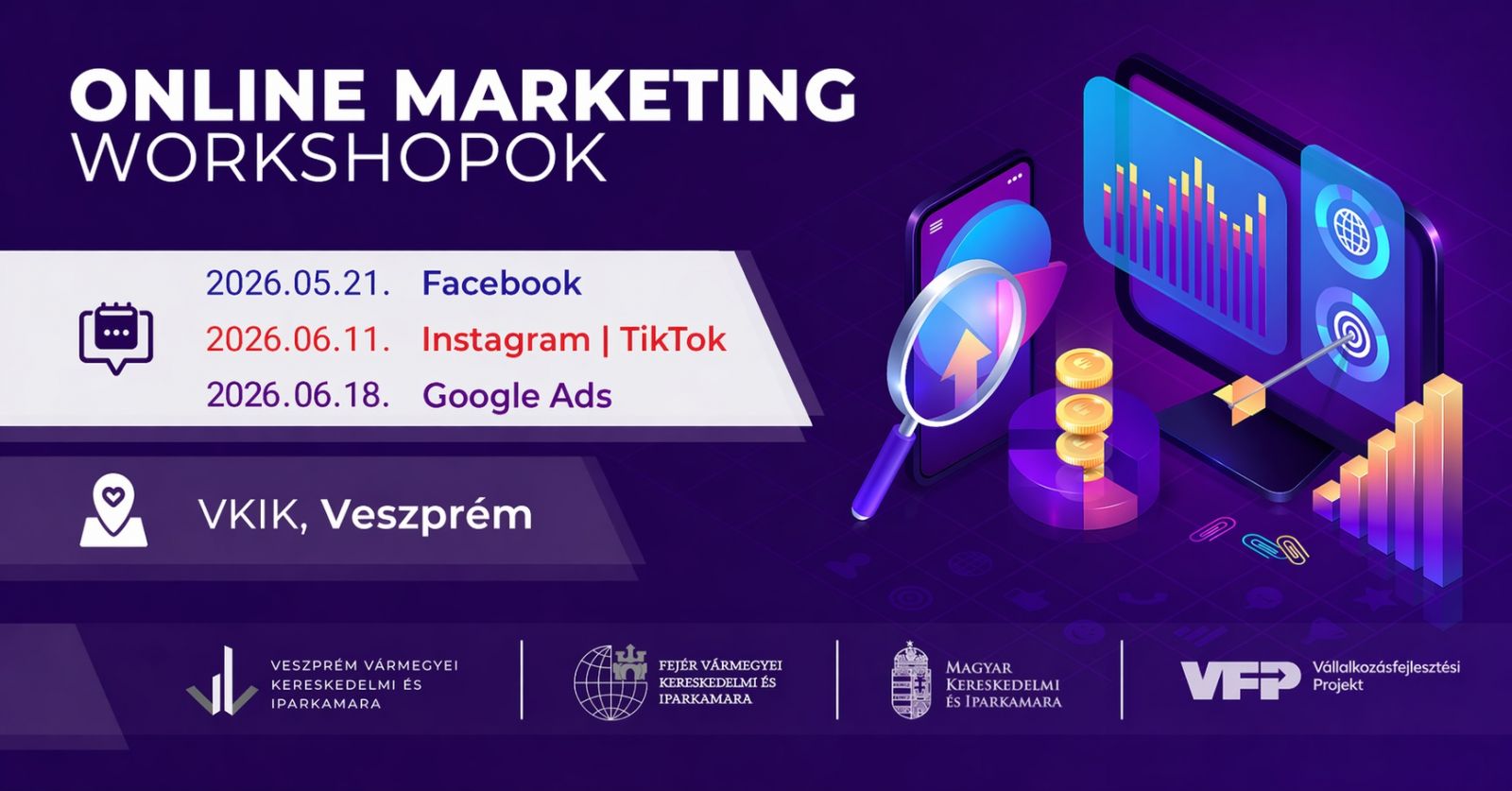 A Veszprém Vármegyei Kereskedelmi és Iparkamara a Fejér Vármegyei Kereskedelmi és Iparkamarával együttmüködésében 3 alkalmas Online marketing workshop-sorozatot szervez, amelynek célja, hogy segítséget nyújtson a vállalkozások – kiemelten az egyéni, mikro- és kisvállalkozások – számára online marketing szakmai területen.