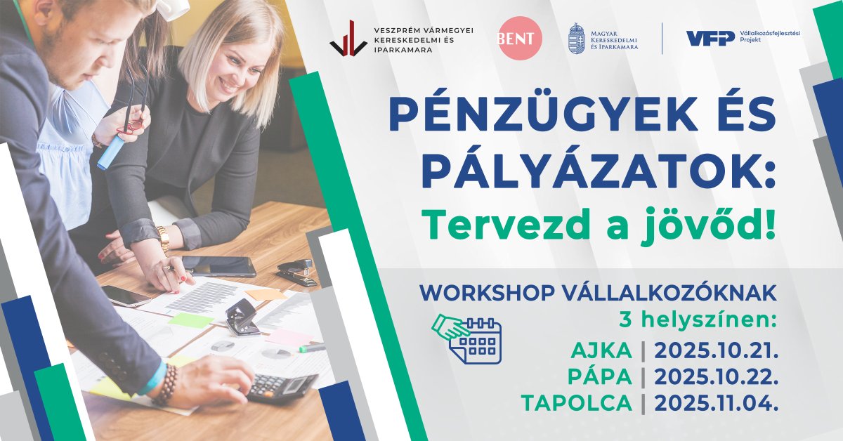 A Veszprém Vármegyei Kereskedelmi és Iparkamara a BENT Szakmai Közösség közreműködésével Pénzügyi és pályázati workshopot szervez Ajkán, Pápán és Tapolcán annak érdekében, hogy a vállalkozások optimalizálhassák pénzügyi lehetőségeiket.