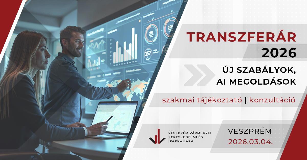 A Veszprém Vármegyei Kereskedelmi és Iparkamara szakmai tájékoztatót szervez a LIFE-IP North-HU-Trans projekt keretében az új transzferár dokumentációs rendeletről, valamint az AI transzferárazásban történő alkalmazásáról vállalkozások részére.