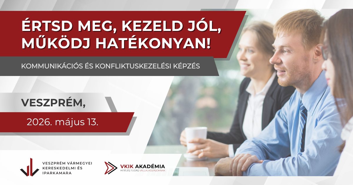 A VKIK Akadémia keretében a Veszprém Vármegyei Kereskedelmi és Iparkamara egynapos, interaktív képzést szervez „Értsd meg, kezeld jól, működj hatékonyan!" címmel, amely a munkáltatók és munkavállalók kommunikációs, együttműködési és konfliktuskezelési készségeinek fejlesztését támogatja a mindennapi munkahelyi helyzetekben.