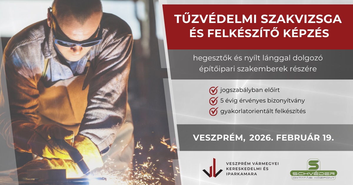 A Veszprém Vármegyei Kereskedelmi és Iparkamara a Schvéder Oktatási Központtal közösen tűzvédelmi szakvizsgát és felkészítő képzést szervez hegesztők és nyílt lánggal dolgozó építőipari szakemberek részére.